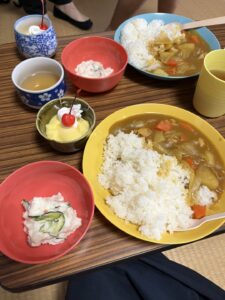お昼ごはんは、カレー、ポテトサラダ、プリン