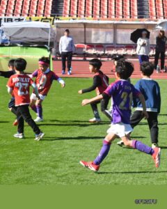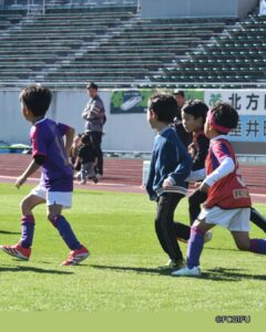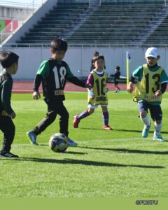 FC岐阜サッカースクールコーチによる直接指導のもと、普段は入ることのできないスタジアムの芝生で、元気いっぱいにボールを追いかけました。