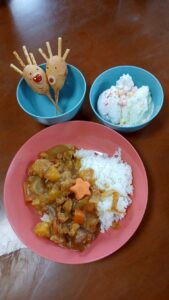 昼食はカレーライス、トナカイアメリカンドッグ(…仕込みが大変でした💦)頂いたフローズンヨーグルトに、頂いた🍓あまおうイチゴを練り込んだアイス、ホイップクリーム&カラースプレーかけ放題✨