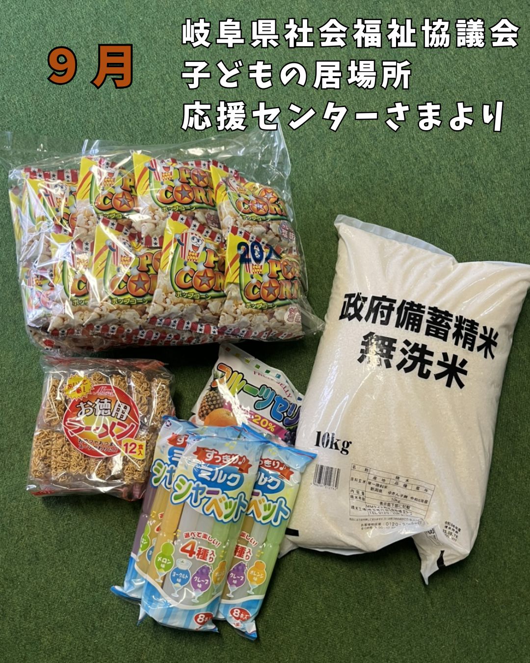 9月も子どもの居場所応援センター様よりみずいろ食堂へ支援品を頂きました! たくさんのお菓子とお米です。 お米は来て頂いた方に分けて配布しました。 いつもありがとうございます。