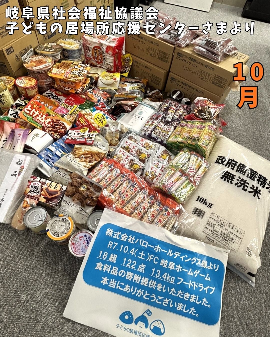 子どもの居場所応援センター様より、 みずいろ食堂へたくさんのお菓子・お米・パンをいただきました🍞🍬🍚 また、バローホールディングス様から 10月4日(土)のFC岐阜ホームゲームで実施された フードドライブにて集まった品々(18組・122点)をご提供いただきました✨ 皆さまの温かいお気持ち[...]