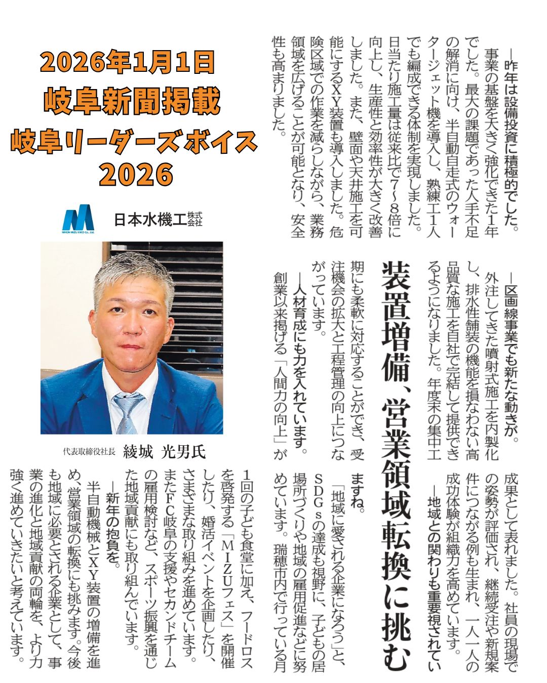 2026年1月1日(木)発行の岐阜新聞「リーダーズボイス2026」に、代表・綾城のコメントを掲載いただきました。 新年を迎えるにあたり、地域への想いや今後の取り組みについてお話しさせていただいております。 本年も地域社会とともに歩み、信頼される企業を目指してまいります。